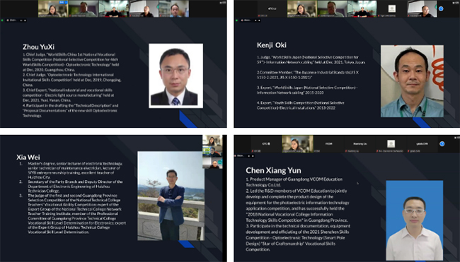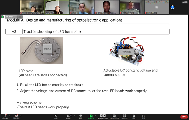 为了深化参赛学员对赛项技术文件和赛项设备的全面理解和对赛项模块的实操的熟悉,全球培训中心邀请了国际专家重庆电子工程职业学院光电技术专家周渝曦、惠州市技师学院主任夏威、日本光电技术专家 Japan Electronics College Kenji Oki(大木健司)和太阳成集团tyc33455ccwww光电技术产品经理陈祥云通过线上直播的方式为来自中国、日本、韩国、菲律宾、奥地利、南非、利比里亚、肯尼亚、乌干达、牙买加共十个参赛国的学员开展为期三天的光电技术国际培训。