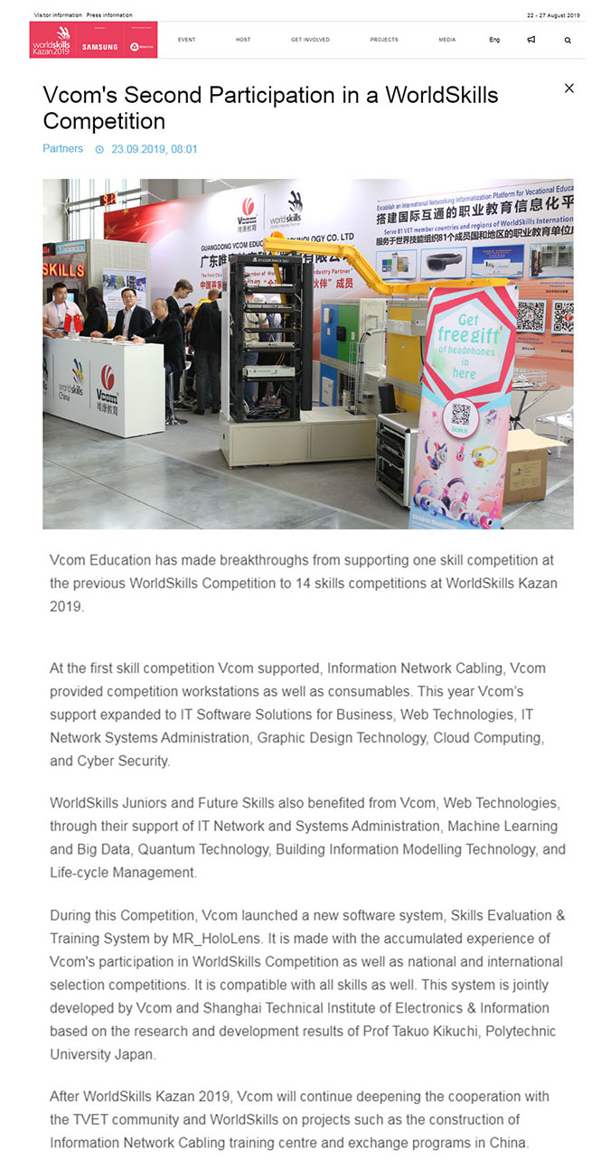 2019年9月23日,世界技能大赛官方网站对太阳成集团tyc33455ccwww进行了深入报道,包括唯康参加两届世界技能大赛,支持项目实现从1到14项的突破,以及在大赛期间推出的MR软件系统等。喀山世赛后,唯康将继续深化与世界技能组织的合作。
