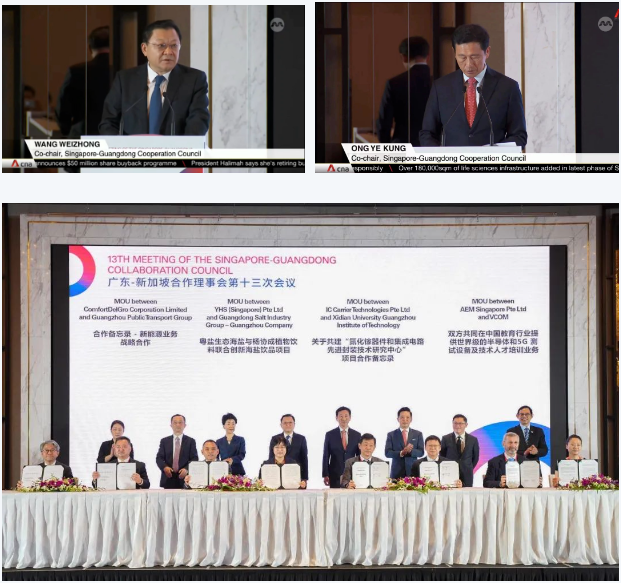 2023年6月26日,广东—新加坡合作理事会第十三次会议暨中国(广东)—新加坡经贸合作交流会在新加坡乌节大酒店举行。广东省人民政府省长王伟中、中国驻新加坡大使孙海燕、新加坡卫生部长王乙康共同出席会议并致辞。会上,双方围绕“全面释放双核驱动效应,聚焦数字经济和绿色经济,开启粤新高质量合作新时代”进行深入交流,签署广东—新加坡合作理事会深化合作备忘录,双方企业在经贸投资、高端制造、数字经济、金融服务、知识产权、人才培训等领域共签署了21项合作协议和备忘录,投资总额预计超过30亿元人民币。