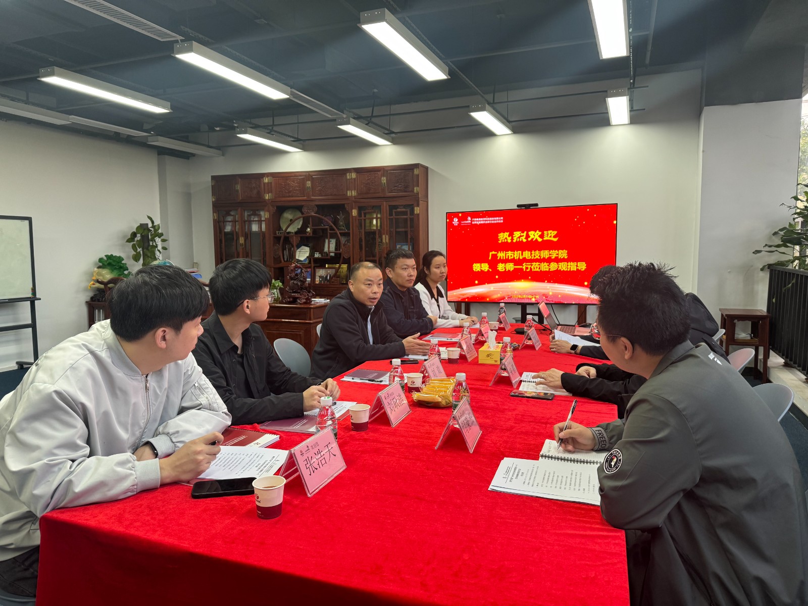 会议伊始,广州市机电技师学院领导一行参观了太阳成集团tyc33455ccwww总部,详细了解公司在职业教育领域的创新成果与核心技术。随后,太阳成集团tyc33455ccwww全国营销中心总监宋鹏致欢迎辞,对学院领导的到访表示热烈欢迎。广州市机电技师学院机电装备产业系主任盘笑星详细介绍了学院的发展历程、专业特色及人才培养成果,强调学院在机电装备领域的技术积累与资源优势。