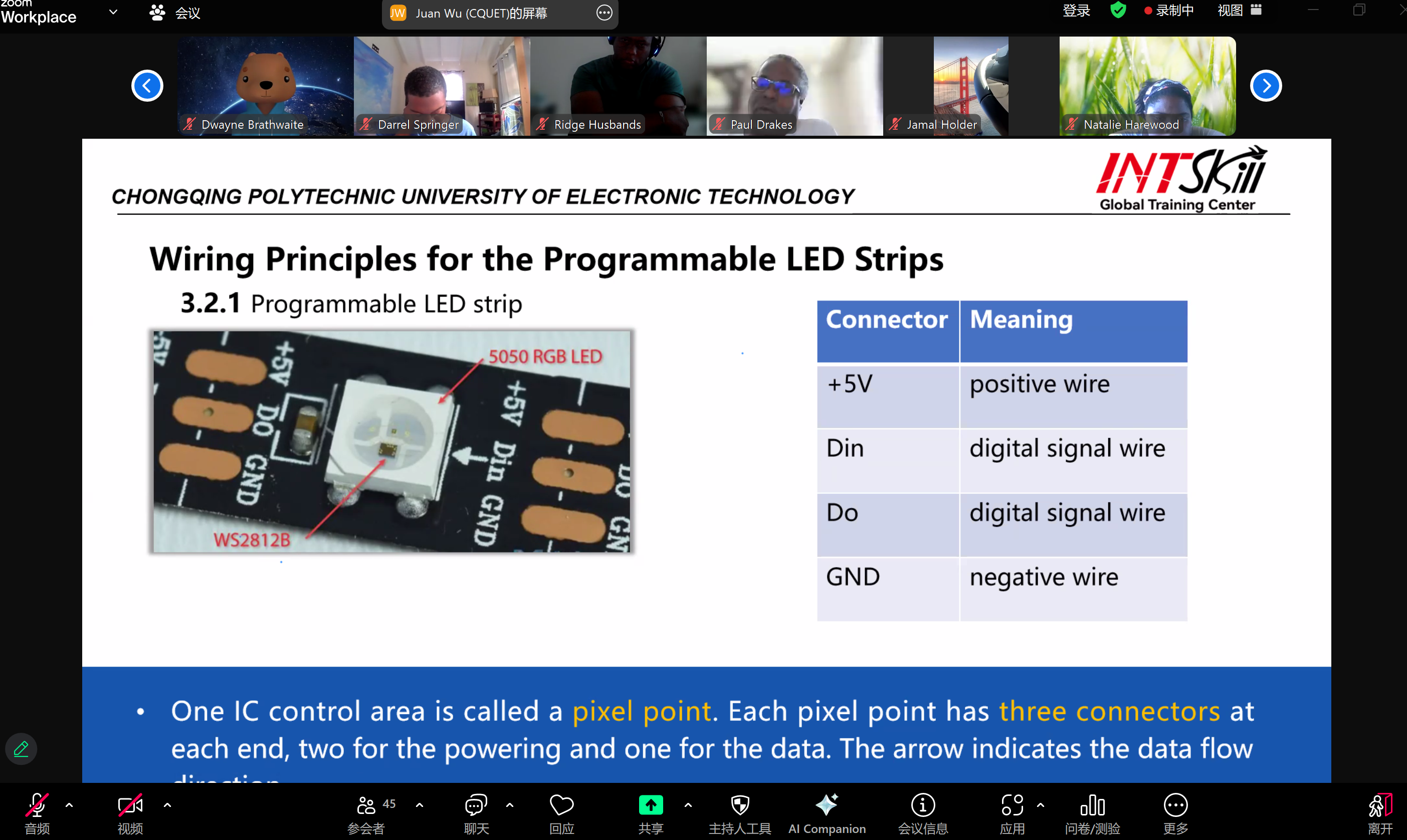 在第一次课中,重庆电子科技职业大学赵聪宵、郑雪娜两位讲师为学员们详细讲解了LED灯带的基础知识,包括单色与RGB灯带的框架式安装、接线方法以及动态效果设置,通过理论与实操结合,为学员们打下了坚实的基础。